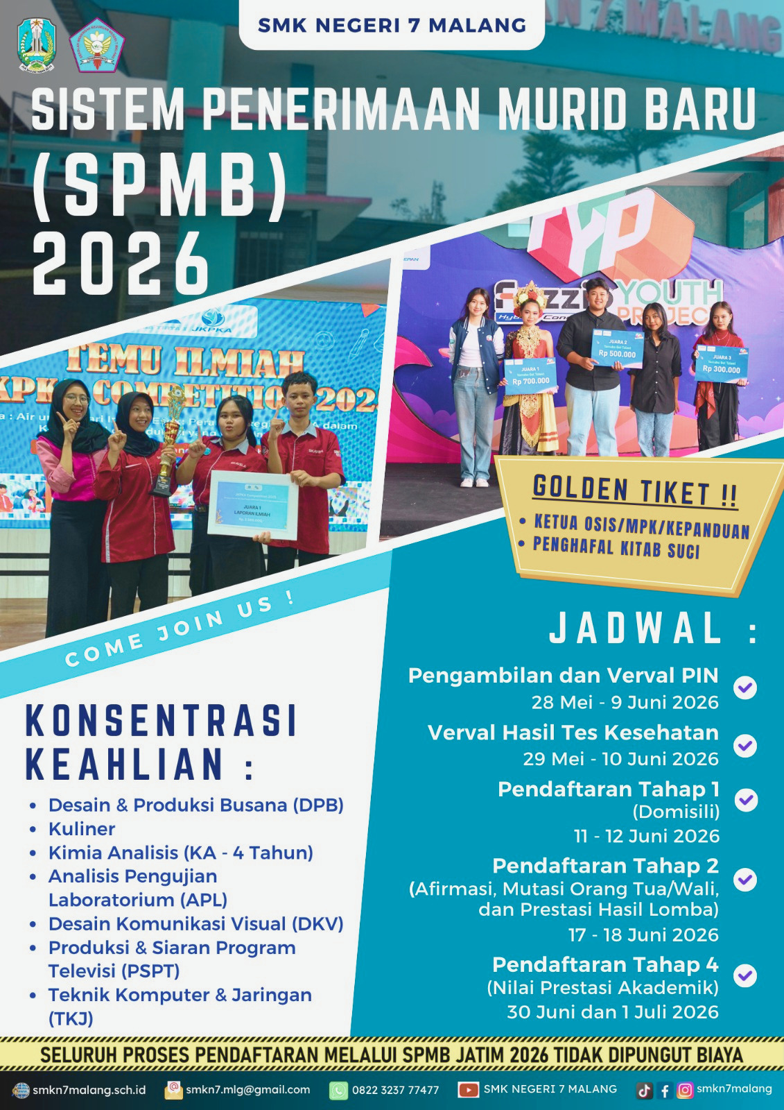 Malang, SKAVELA.THISWEEK – Sistem Penerimaan Murid Baru (SPMB) 2026 SMK Negeri 7 Malang kembali dibuka sebagai pejuang lanjutan untuk meraih sekolah impian. Bagi pejuang SPMB yang masih berproses di jalur seleksi, kesempatan ini bisa menjadi langkah berikutnya. Pastikan kamu memahami alur pendaftaran, menyiapkan persyaratan, serta memilih konsentrasi keahlian dengan tepat. Manfaatkan peluang ini sebaik mungkin dan tetap percaya pada proses yang sedang kamu jalani.